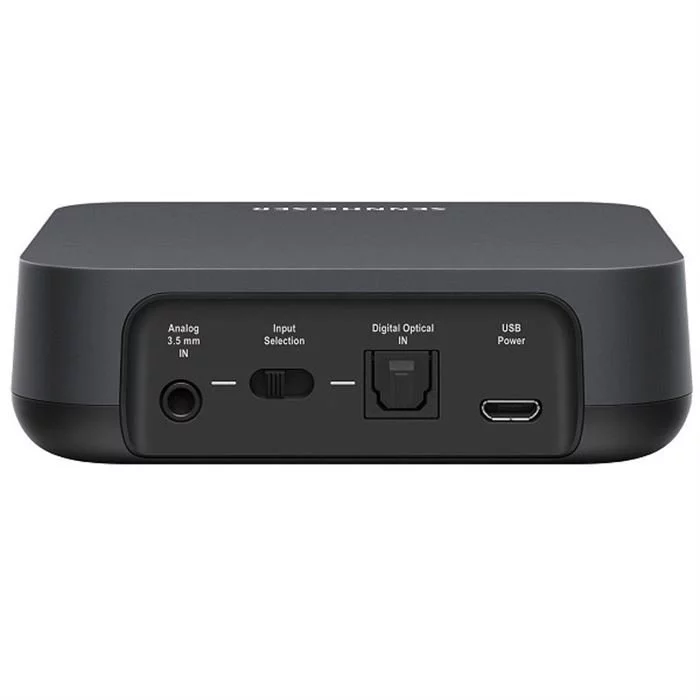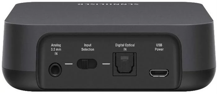 Außerdem verfügt der Transmitter über einen 3,5 mm- Klinkenanschluss und einen optischen Eingang.